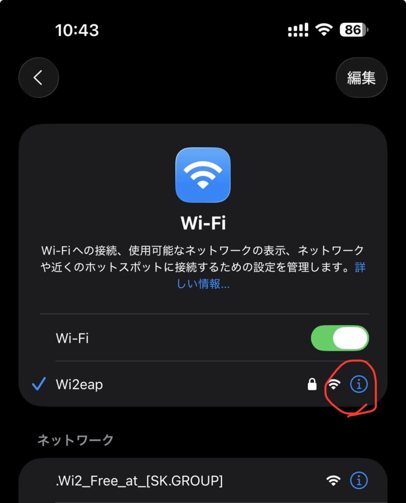 その状態でiOSの「設定」アプリを開き、Wi-Fi設定画面にいくと「Wi2eap」という設定ができてると思うので、右側「i」ボタンをタップします。