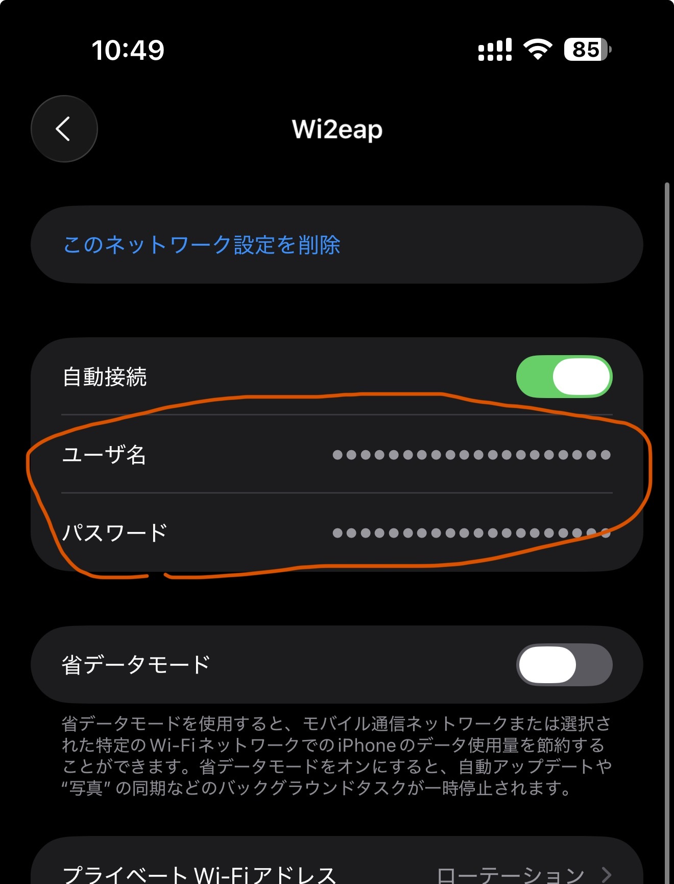 すると詳細画面が開きます。ここにユーザー名、パスワード欄があり、タップするとFaceID/TouchIDで認証された後、「お客様IDとは似ても似付かない文字列に@gigazo@wi2がついたID」と「見たこともない長いパスワード」が表示されます。これをMac側で表示されているID/PWとして入力するとあら不思議、すんなり接続/認証できました。