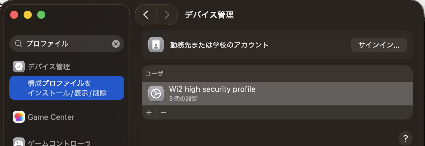正常に完了していれば、「設定」アプリで「プロファイル」と検索すると「構成プロファイルをインストール/表示/削除」という項目がヒットし、選択すると右側に「Wi2 high security profile」という項目が表示されるはずです。