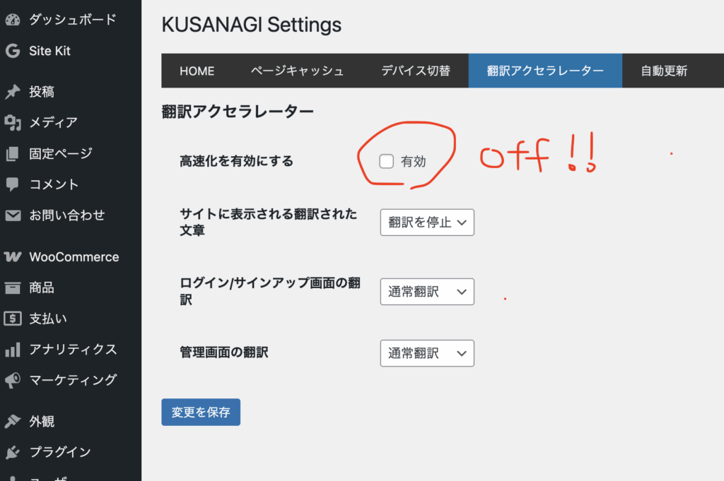 ということで、もしKUSANAGI環境でWooCommerce(や他のプラグイン)の英語表記が残る問題に直面したら翻訳アクセラレーターを切ってみることをお勧めします。