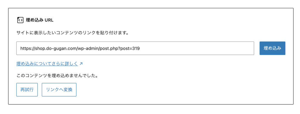 通常はWordPress同士ならoEmbedというOGPのようなヘッダー情報があり、WordPressのGutenbergエディタにURLをペーストするだけでカード形式になってくれます。しかしなぜか今回の2サイト間では上手くいかない。