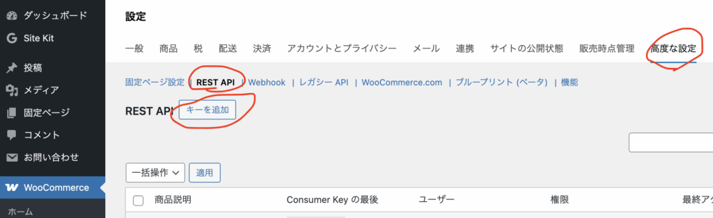 まずは読み出される側(ソース)のWordPressの管理画面を開き、WooCommerceプラグインの設定画面から「高度な設定」→「REST API」を開いて、「キーを追加」で発行します。今回は商品情報を参照するのみなので、権限を「Read」にしておけば万一キーが漏洩しても情報を書き換えられないのでお勧めです。
