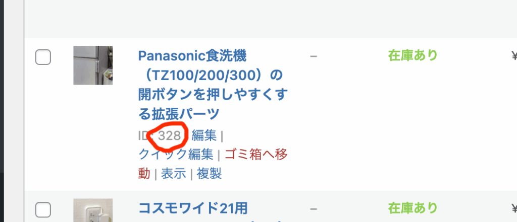 特定の商品を参照するID番号を調べます。WooCommerceの商品一覧で赤丸の箇所に表示されるのが商品IDです。