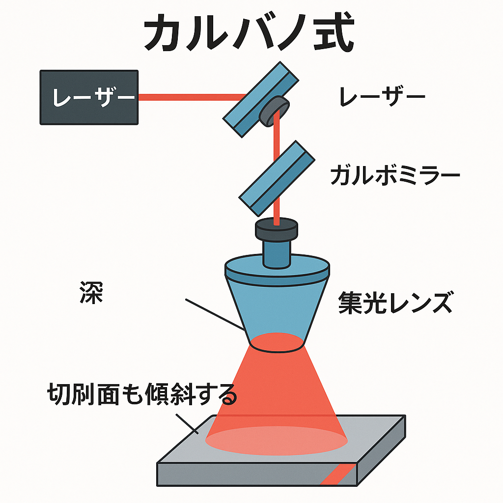 次にレーザーヘッドの動かし方でX-Y式とガルバノ式という違いがあります。X-Yは文字通りヘッドが縦横に動いて軌跡を作る方式です。プロッタプリンターや多くの3Dプリンター、カッティングマシーンなどと同じです。対してガルバノ式はヘッドは一箇所に固定で、レーザを反射する鏡の角度を変えて広範囲にレーザーを当てる仕組み。DLPプロジェクターの親戚みたいなもんでしょうか。ChatGPTさんにイメージ図を描いてもらいました。文字がだいぶあやしいのはご愛敬。