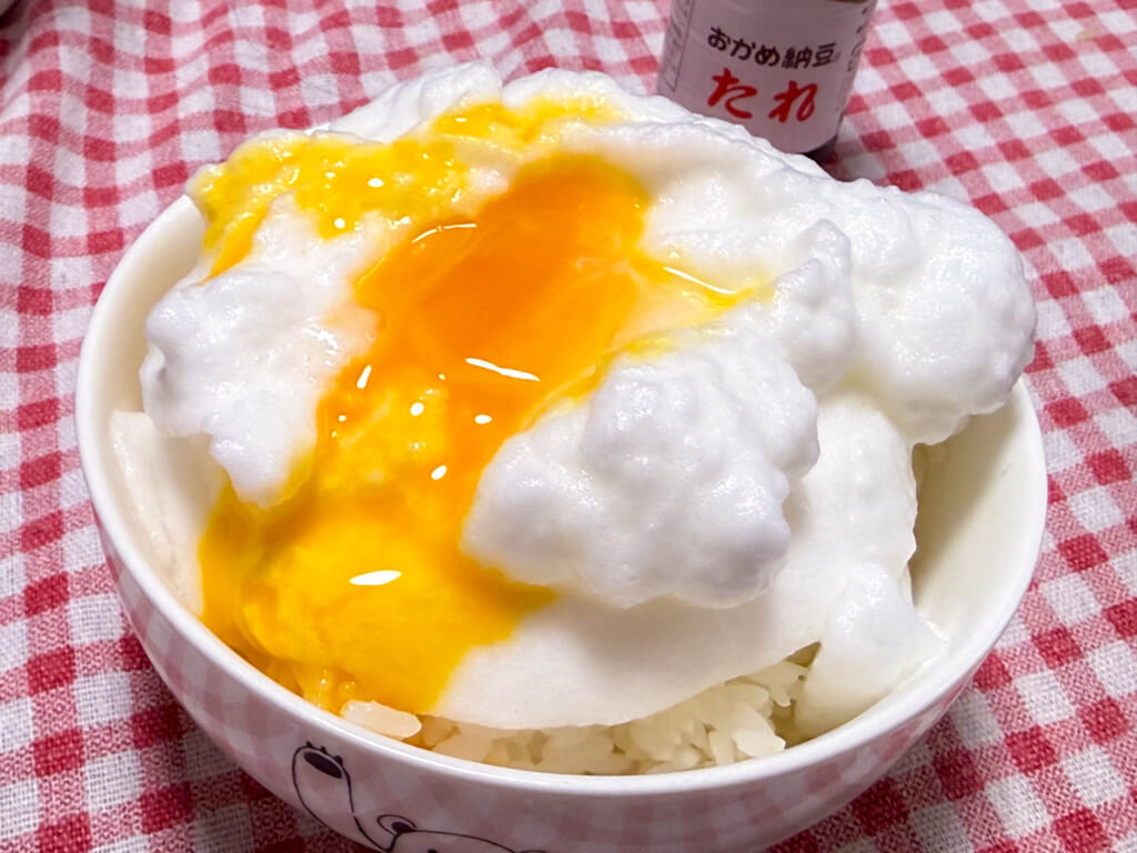 卵白をメレンゲに泡立てるTKGレシピです。めっちゃふわふわの食感で衝撃でした。