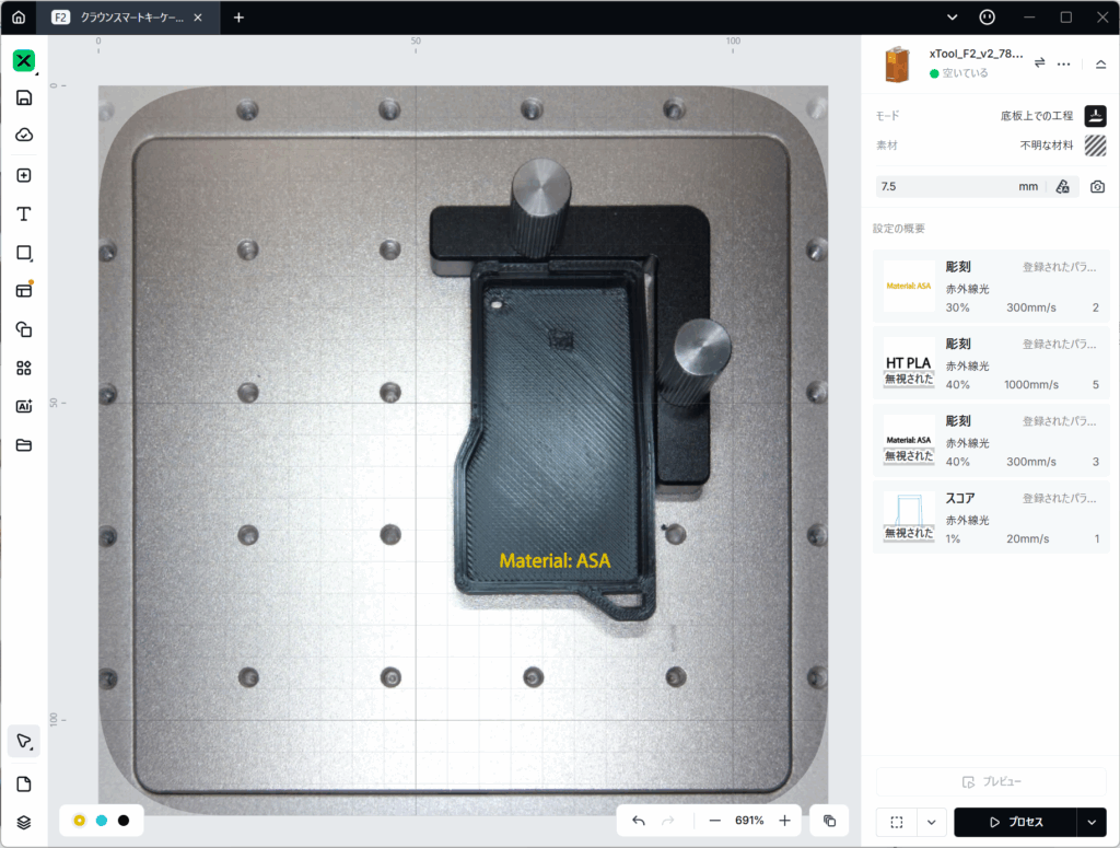 ただ、F2ではそもそもこのレーザーを使ったプレビューを使う機会はあまりなくなるかも知れません。レンズに隣接するカメラが搭載され、xTool Studio上で位置あわせできるようになったからです。その様子がこちら。