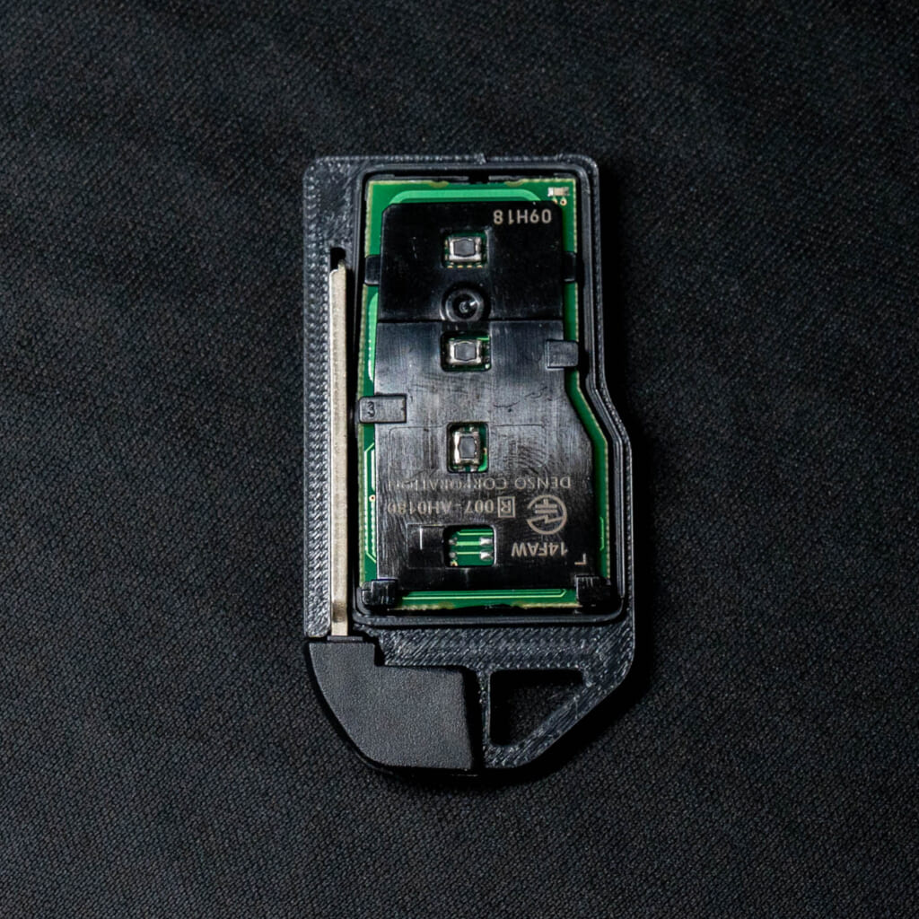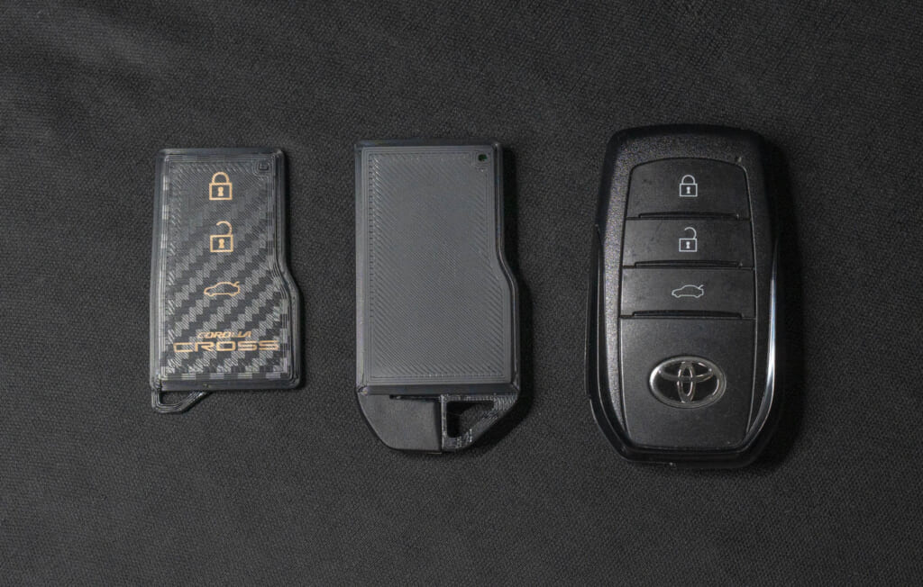メカキーを廃して基板ギリギリサイズのケースを3Dプリンターで自作したのです。今回はメイン車両である新型クラウン用のものについても改めてチャレンジしてみた、という記事になります。先の写真のスマートキーはトヨタの現行車種の多くでも使われているタイプです(ハリアー、カローラシリーズ、ヤリスシリーズなど、電動ハッチバック非搭載車は2ボタン)。