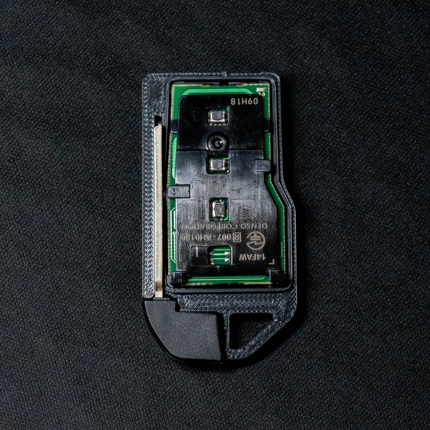 我が家のクラウンクロスオーバーにはAUTHOR ALARM社のカーセキュリティIGLA2+を搭載しています。乗車時の自動セキュリティ解除のために、小さなタグ(キーフォブ)を携帯しておく必要があるのですが、これも樹脂カバーを外すと電池と小さな基板で構成されていますので、ついでとばかりに本ケースの底に搭載できるようなバージョンも作成しました。