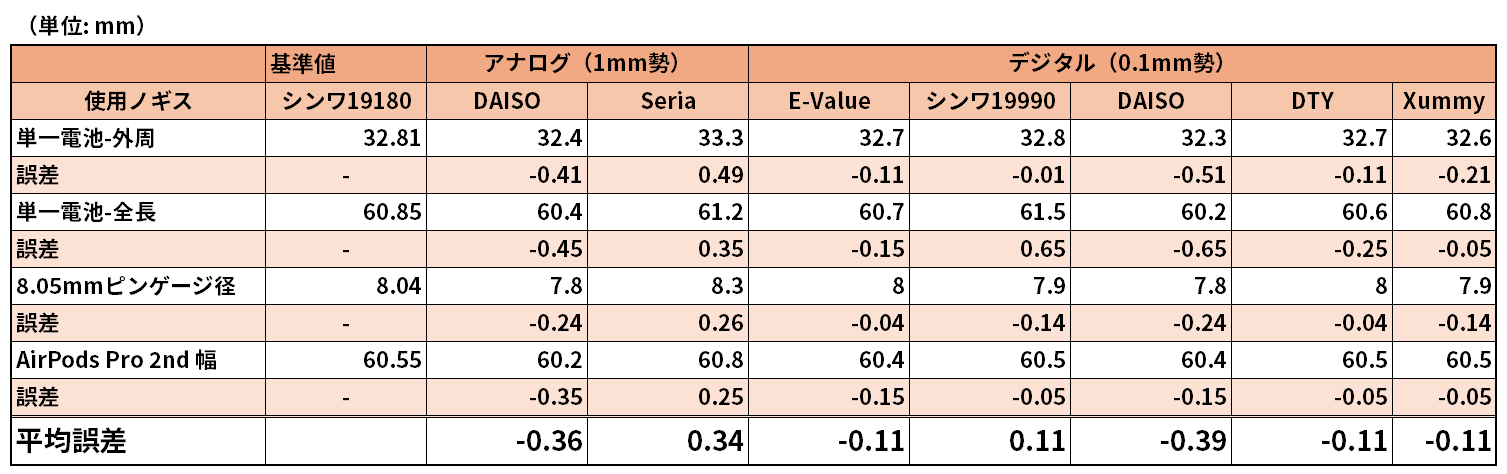 結果です。(2026.4.03 Xummyの300mノギスのデータを追加しました)