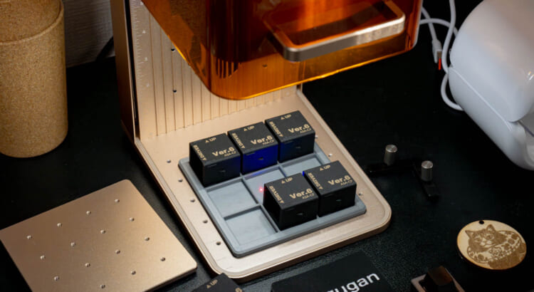 レーザー加工機xTool F2にはカメラが搭載されて、適当に並べた複数アイテムに同じレイアウトでAIが位置決めをしてくれる「バッチフィル」機能があり、量産に便利です。