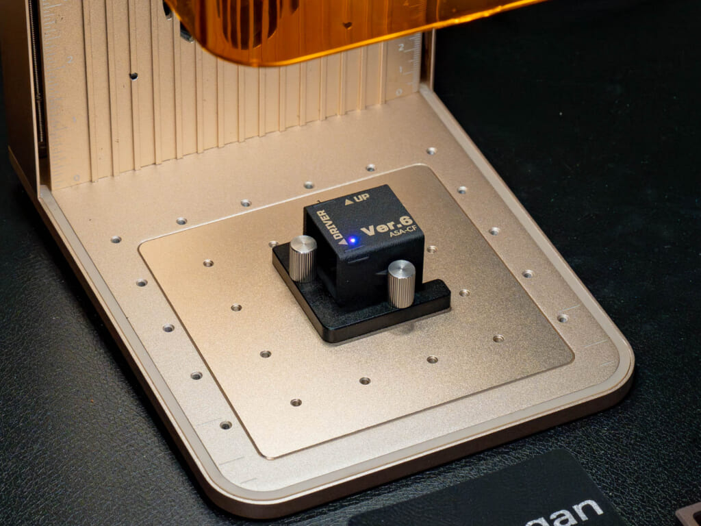 このアイテムは正方形なので割とあわせやすいですが、それでもコツンと当てたつもりでも反動で離れてしまったり、アクリルシールドを降ろしたショックでズレてしまったりと、慎重な作業を求められていました。3Dプリント品は軽いのでわずかな振動でもブレてしまいます。さらにこれがもっと複雑な形状のアイテムだと単純に沿わせるだけ傾きなども気にしなければならなくなります。そしてなによる一度に1アイテムしか加工できない。
