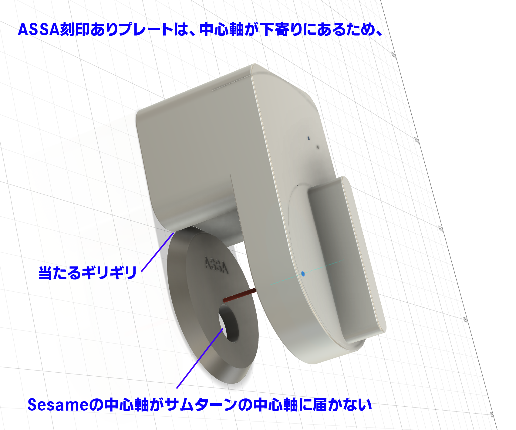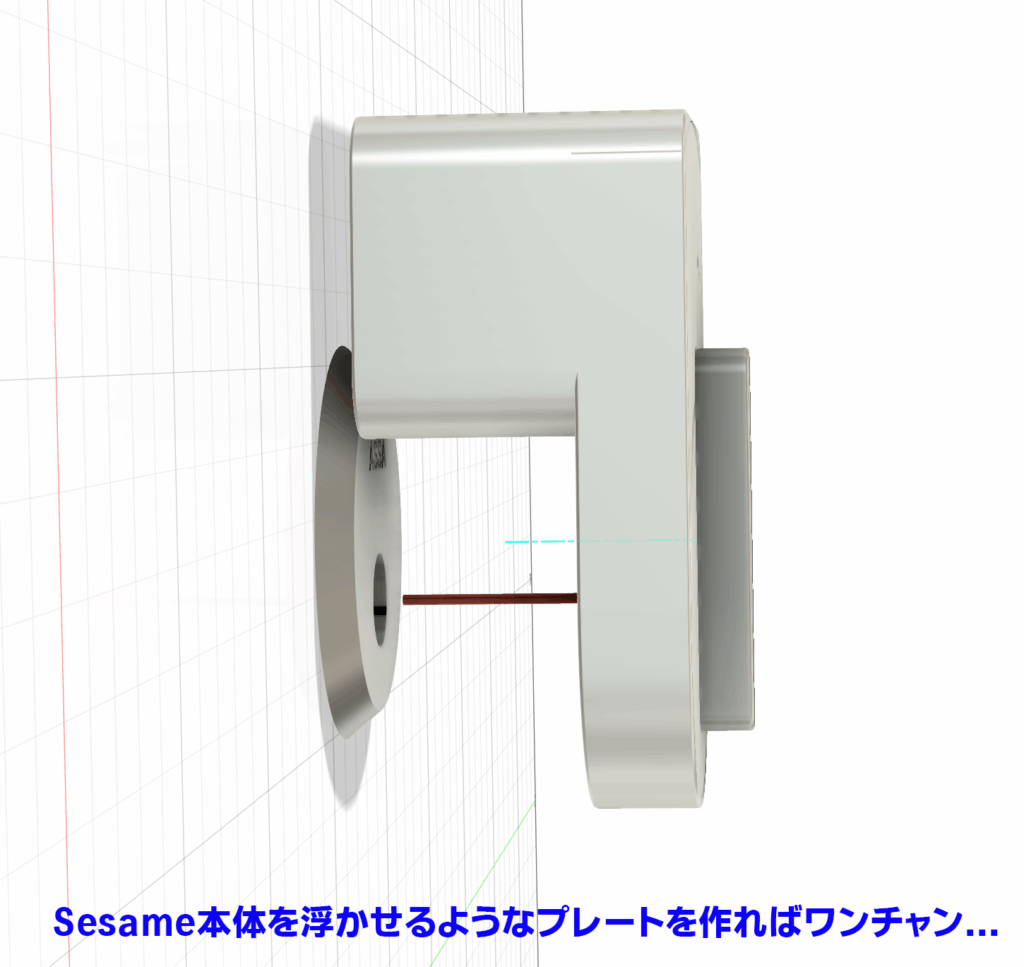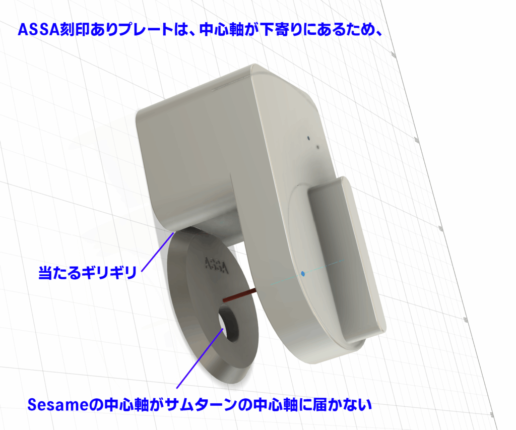 より下に下がっているので、ベースプレート位置基準でSesameを設置した場合、Sesameの回転軸とサムターンの回転軸のズレが大きくなってしまいます。ある程度のズレはSesameの機構でカバーできるのですが、やはり回転が渋くなったり、物理鍵での解錠施錠操作時に負荷となってしまうようです。