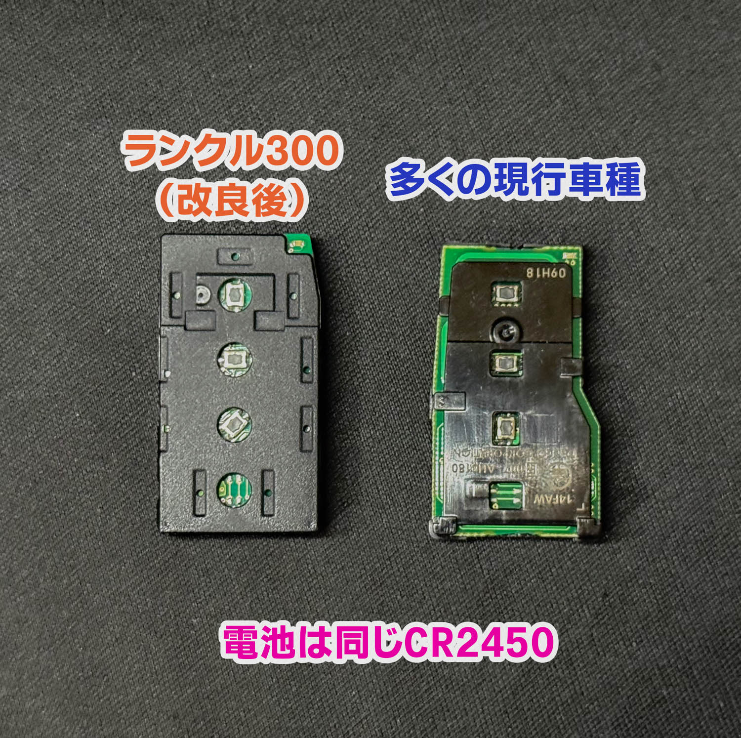 想像ですが改良後ランクル300は前述のUWB機能を搭載しているので、内部ユニットが新規設計になったんじゃないでしょうか。改良前ランクル300の電池交換動画とかみた限り、写真右のタイプのようなので、おそらく現時点で左のものは改良後ランクル300専用(もしくはLEXUSの一部車種は共有?)なんじゃないかと。