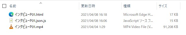 これら3つが拡張子違いの同名で同一フォルダ内に揃っている必要があります(.dggn.txtは必要ありません)。例えば、動画がhoge.mp4であれば、hoge.json.jsとhoge.htmlが同じ階層に存在するようにします。1つのフォルダにこの3点セットが複数組混在していても構いません。htmlファイルが開かれると、自身のファイル名を調べて、同名の動画とデータファイルを自動的に開きにいきます。